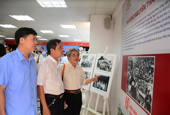 Các đại biểu tham quan trưng bày một số hình ảnh, hiện vật của nhà báo Nguyễn Thành Lê.