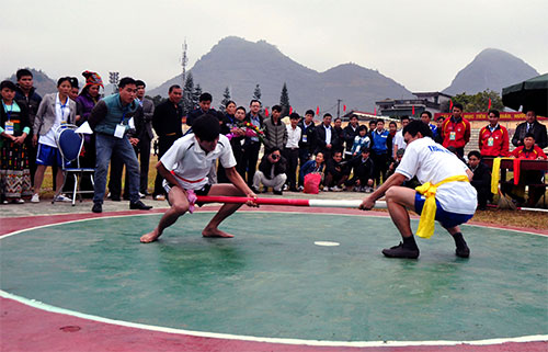 Đẩy gậy - một môn thể thao truyền thống thi đấu trong ngày hội.
