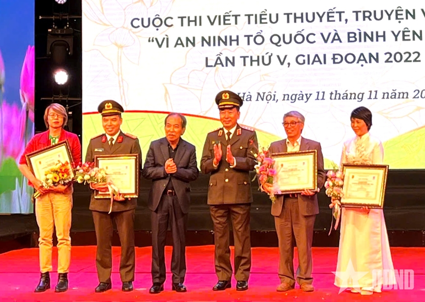 Ban tổ chức trao giải Cuộc thi viết tiểu thuyết, truyện và ký về đề tài “Vì an ninh tổ quốc và bình yên cuộc sống” lần thứ V, giai đoạn 2022 - 2025 cho các tác giả.