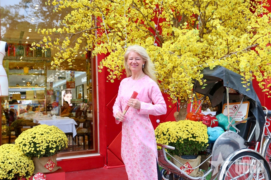 | Du khách nước ngoài thích thú diện áo dài, hòa mình vào không khí du xuân đầu năm tại TP Hồ Chí Minh. |