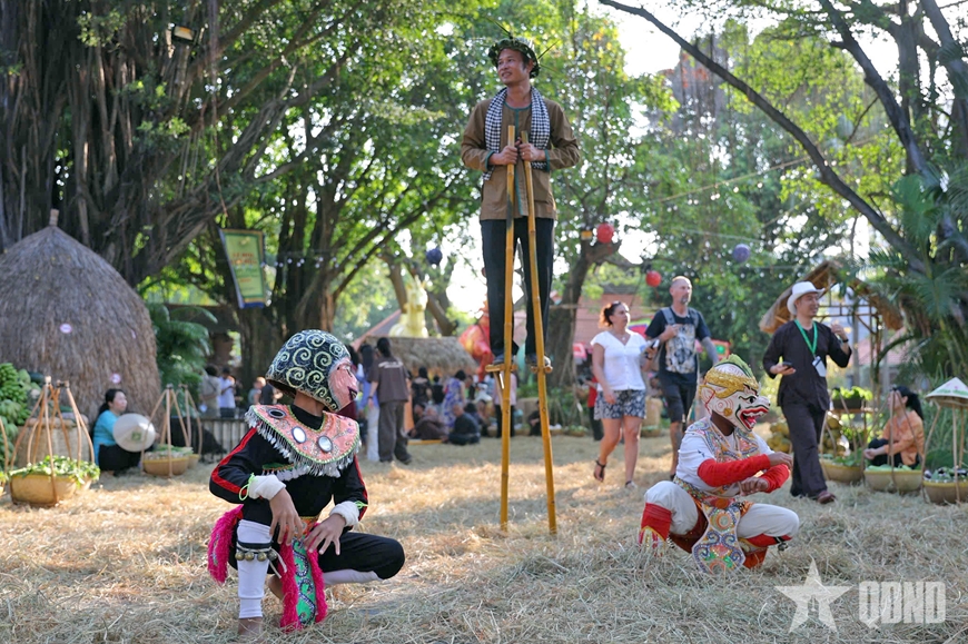 | Biểu diễn múa khỉ, đi cà kheo tại khu vực cổng chào lễ hội. |