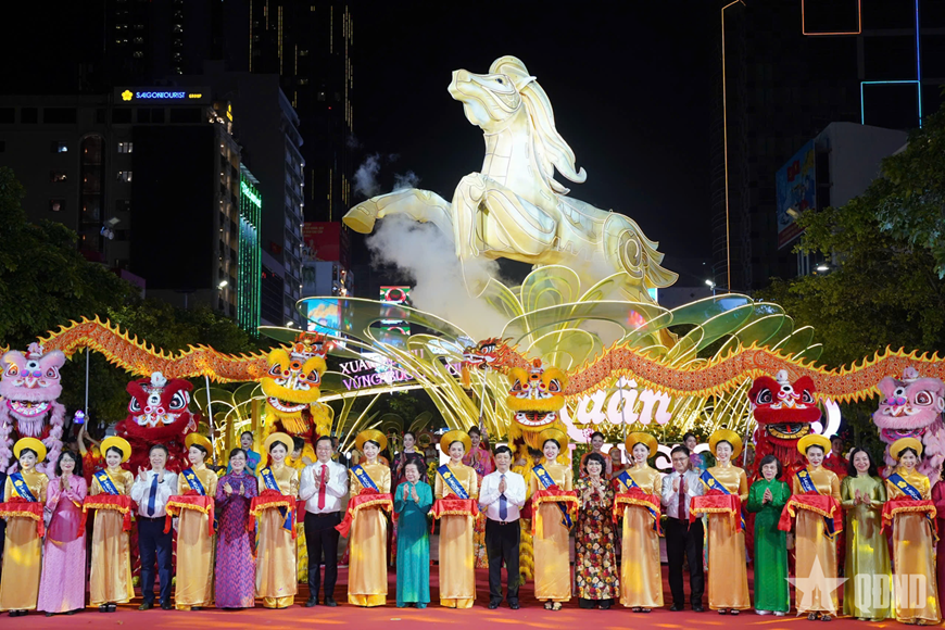 Đường hoa Nguyễn Huệ - Tết Bính Ngọ 2026 tại khu vực phố đi bộ Nguyễn Huệ được phân thành 3 chương: Xuân hội nhập - Cội nguồn gấm hoa - Tương lai vững bước, với các đại cảnh, tiểu cảnh được trưng bày từ hơn 100.000 giỏ hoa đa chủng loại. Điểm nhấn của công trình đường hoa là các đại cảnh: “Nhất mã thong dong”, “Ngựa chín hồng mao”, “Lý ngựa ô”, “Rực rỡ miền ký ức”, “Giang sơn cẩm tú”… được thiết kế các linh vật năm Ngọ độc đáo.