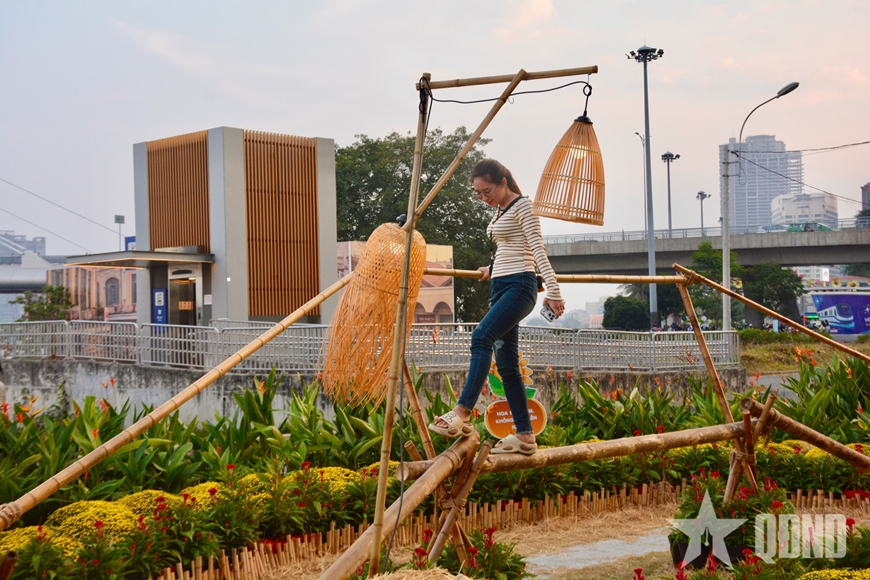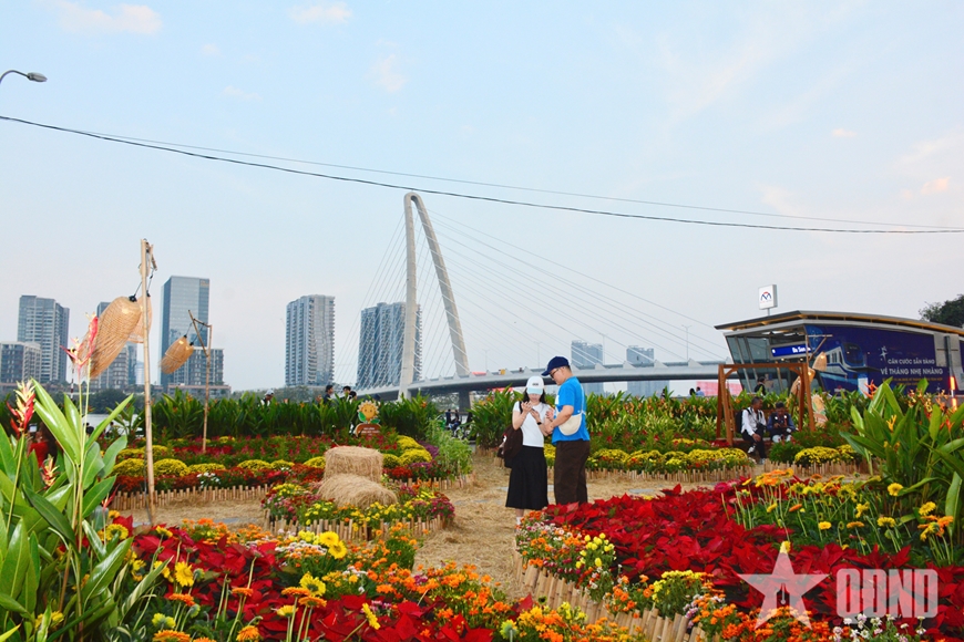 | Sắc hoa xuân rực rỡ dưới chân cầu Ba Son thu hút đông đảo người dân và du khách. |