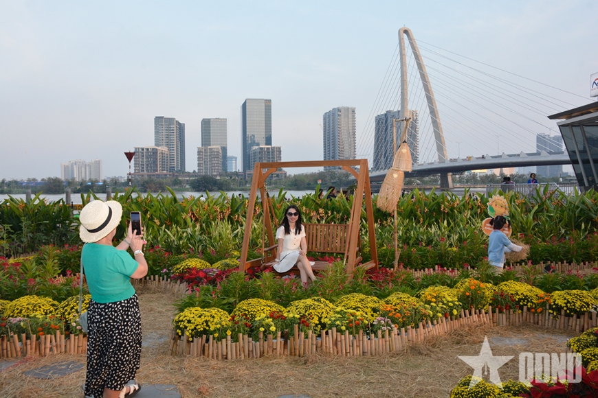 Buổi chiều nghiêng nắng trên bờ sông Sài Gòn, vườn hoa dưới chân cầu Ba Son thu hút nhiều người dân TP Hồ Chí Minh đến tận hưởng sớm không khí Tết.
