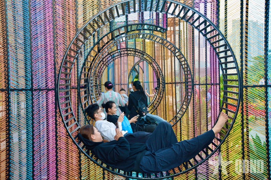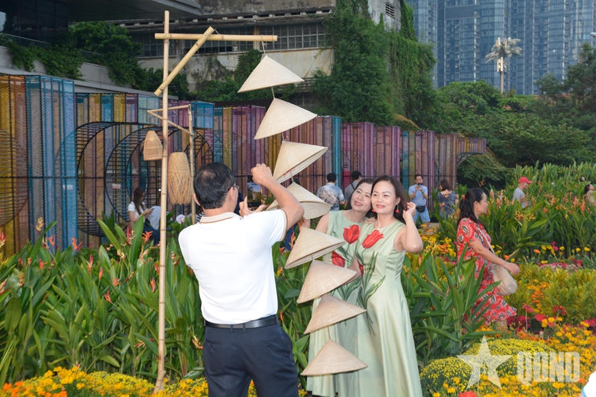 Giữa lòng đô thị hiện đại, xung quanh là các cao ốc chọc trời, vườn hoa xuân này là không gian lý tưởng để người dân dạo bước, giải tỏa áp lực sau một ngày học tập, làm việc căng thẳng.