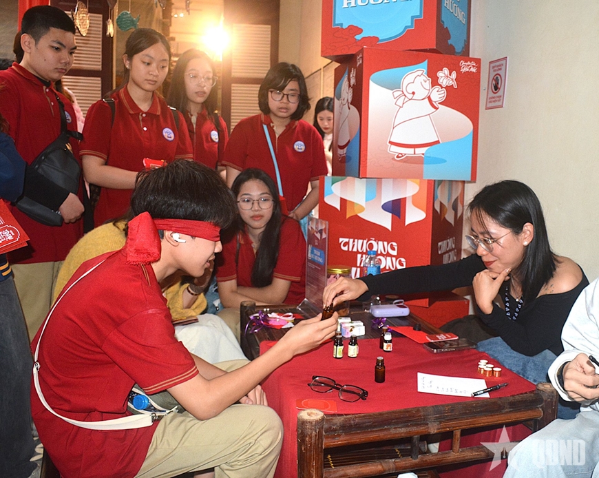 | Trạm Đủ hương thu hút công chúng với trò chơi đoán mùi hương đặc trưng của Tết. |