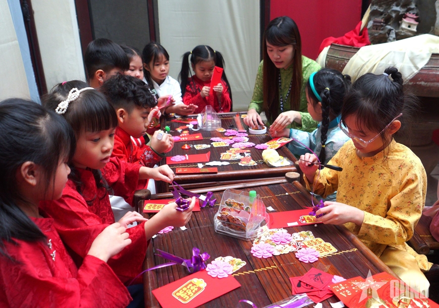| Hoạt động trang trí bao lì xì tại trạm Đủ chạm được trẻ em thích thú. |