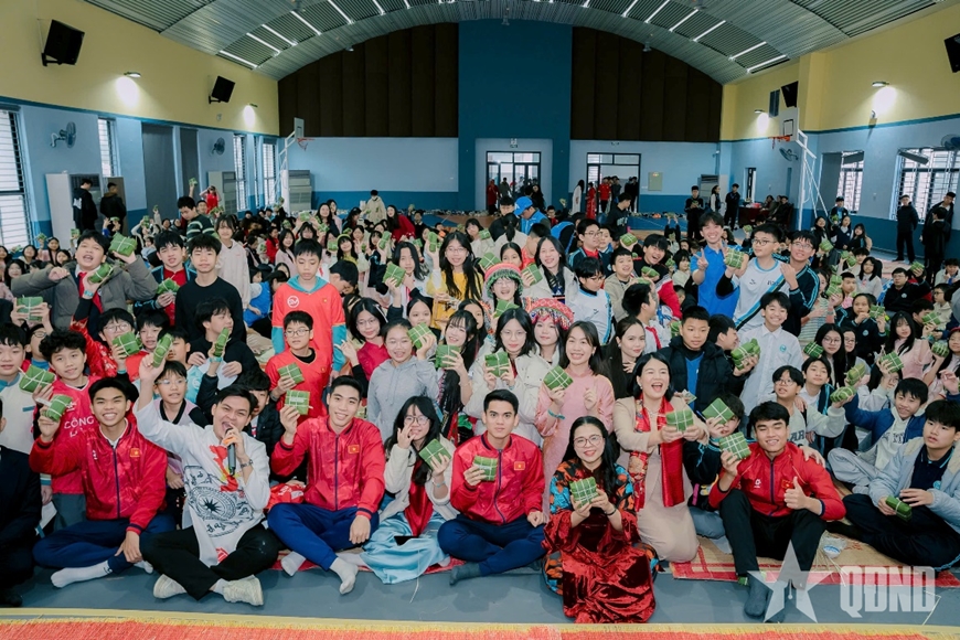 Cùng với hoạt động giao lưu, Chương trình “Lễ hội Giảng Võ 2-Chào Xuân 2026” còn đậm sắc Tết truyền thống qua hoạt động “gói bánh chưng-giữ hồn Tết Việt”. Trong không khí ấm áp đầu xuân, học sinh cùng thầy, cô giáo tham gia gói bánh theo nhóm, từ khâu chuẩn bị nguyên liệu đến hoàn thiện sản phẩm. Hoạt động không chỉ giúp các em hiểu hơn về phong tục Tết cổ truyền mà còn rèn luyện tinh thần phối hợp, ý thức trách nhiệm và sự tuân thủ quy trình trong hoạt động tập thể; hiểu rõ hơn về phong tục Tết cổ truyền, ý nghĩa của gia đình, quê hương và tinh thần “uống nước nhớ nguồn”.