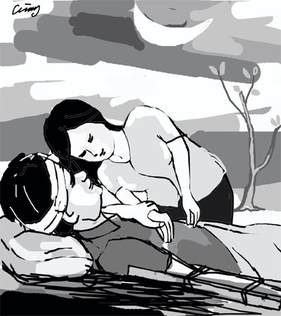 Thằng Ngư xúc động luống cuống tìm bàn tay con Nhạn. Con Nhạn đan xiết bàn tay thằng Ngư rồi kề sát mái đầu nó. Chưa bao giờ hai đứa cảm được sự dịu ngọt của tình yêu đến đam mê hòa quyện thế này. Con Nhạn muốn nghển lên để tìm môi thằng Ngư quá. Nó chưa bao giờ biết đến cảm giác được hôn. Rồi nó lại không dám. Nó ôm siết chặt lấy người thằng Ngư.