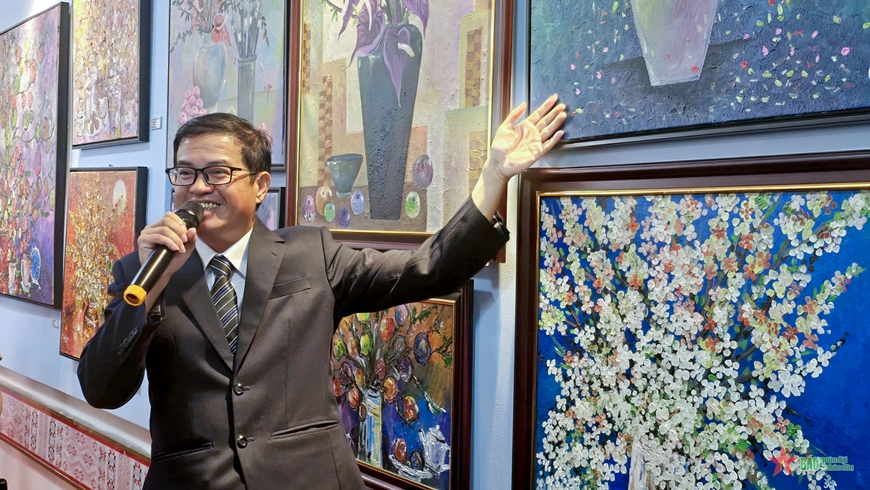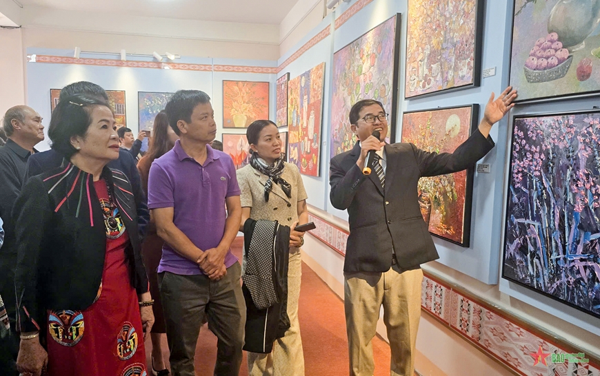 | Họa sĩ Mai Quý Ngọc giới thiệu tranh tại triển lãm. |