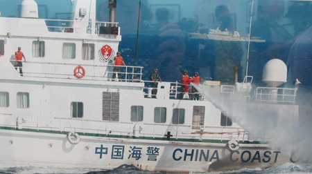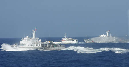| Ba tàu hải cảnh, hải giám, tàu kéo dịch vụ của Trung Quốc đồng loạt phun nước tấn công tàu kiểm ngư của Việt Nam. Ảnh: Mai Thanh Hải |