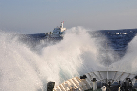 | Tàu của biên đội kiểm ngư vùng 4 tăng tốc tiếp cận khu vực hạ đặt giàn khoan Hải Dương 981. Ảnh: Mai Thanh Hải |