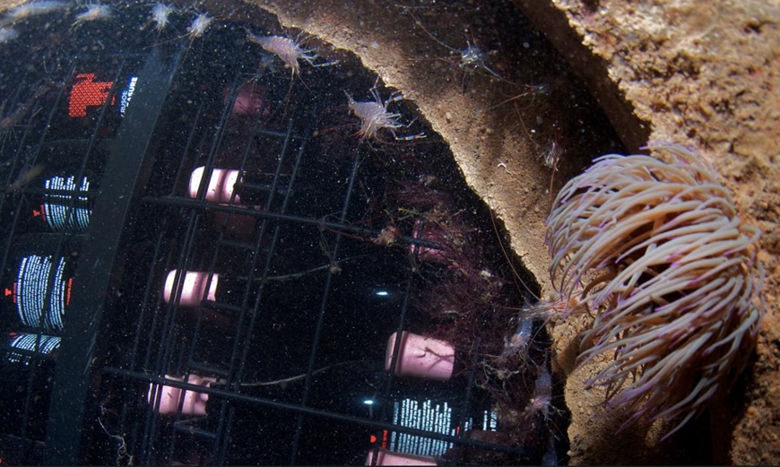 | Hải quỳ và giáp xác sinh sống quanh những chai rượu "ủ" dưới đáy đại dương. Ảnh: Bodega Crusoe Treasure |