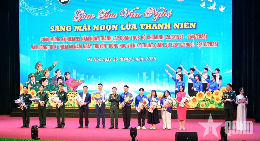 Thiếu tướng Trần Văn Duy, Phó chính ủy Học viện Kỹ thuật Quân sự tặng hoa các học viện, nhà trường Quân đội và các đơn vị kết nghĩa tham gia giao lưu văn nghệ.