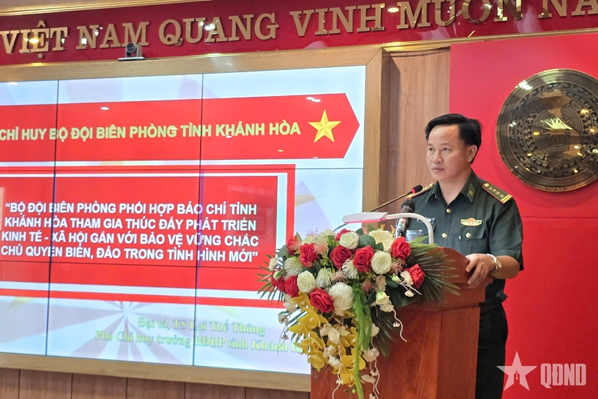 | Đại tá, Tiến sĩ Lại Thế Thông, Phó chỉ huy trưởng Ban chỉ huy Bộ đội Biên phòng tỉnh Khánh Hòa trình bày tham luận. |
