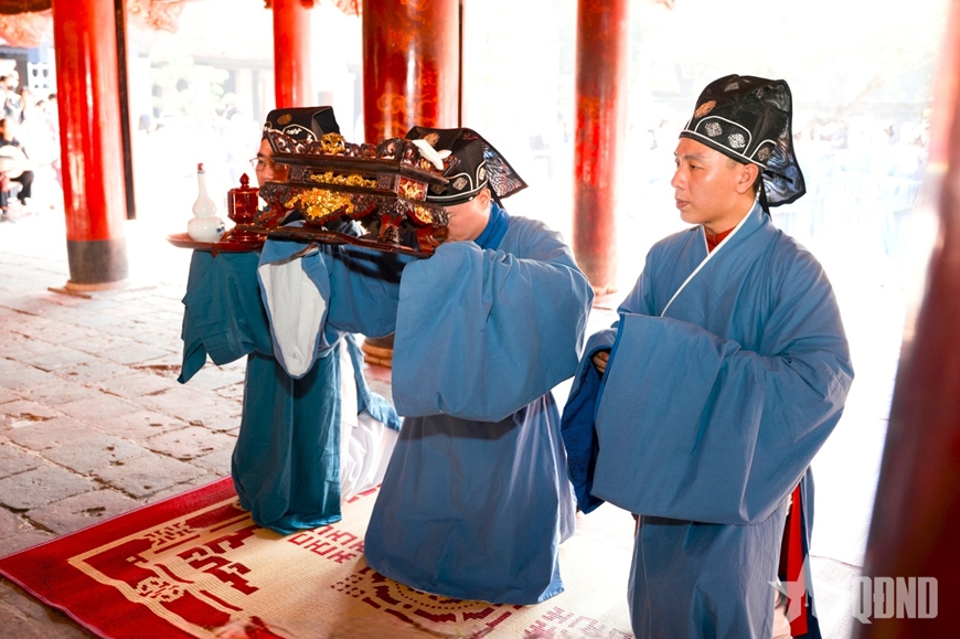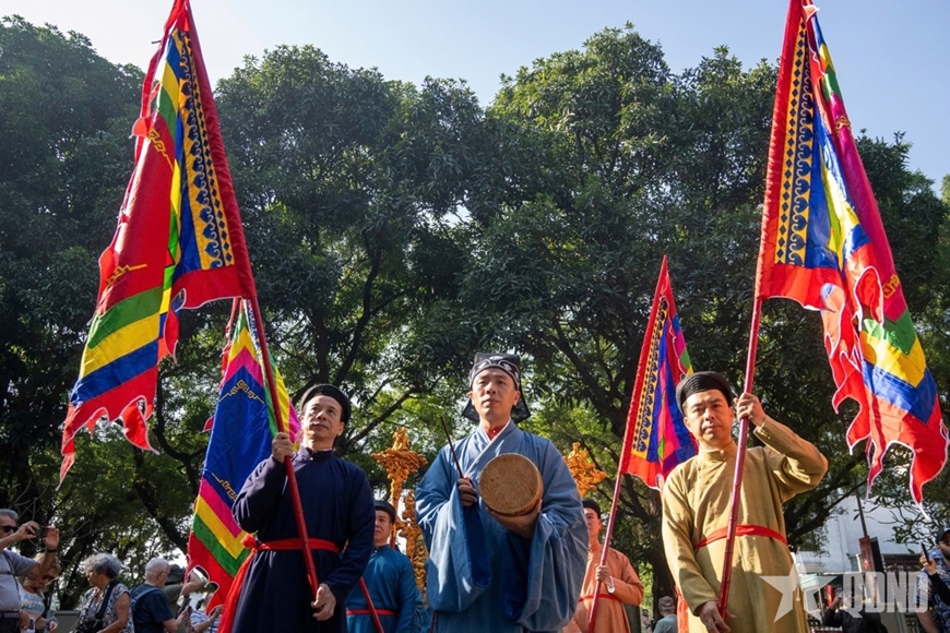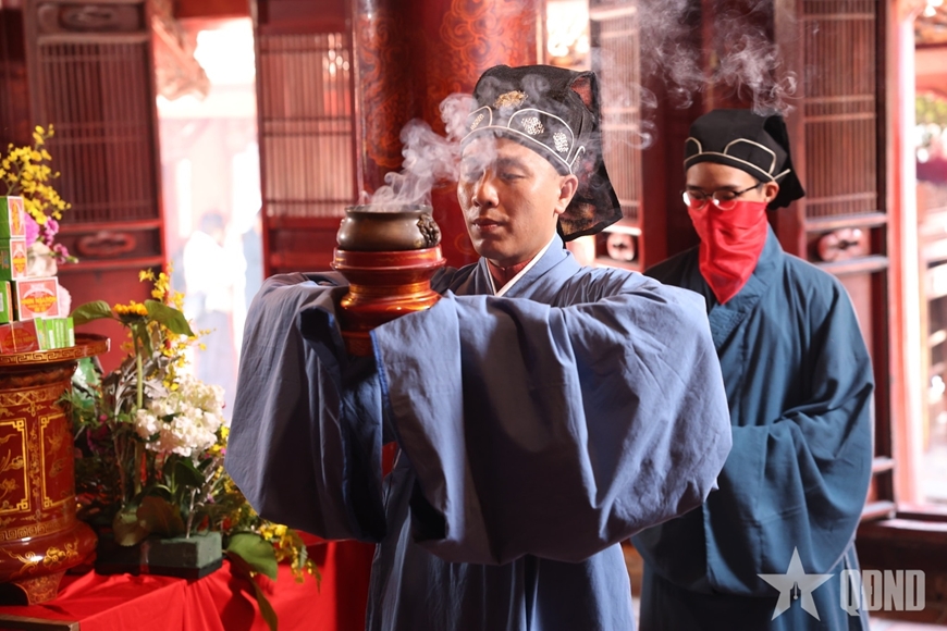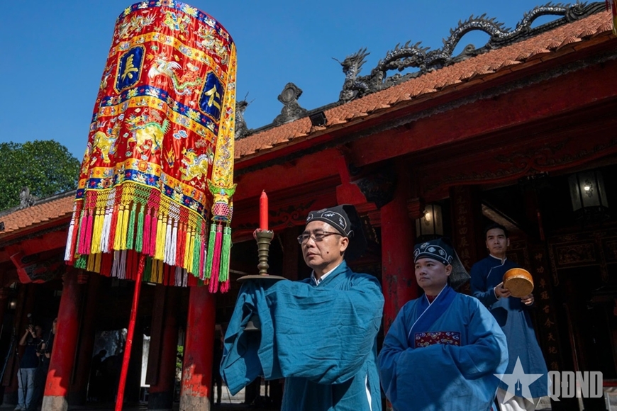 Trong ánh nắng đầu ngày còn vương hơi sương, lễ rước từ hồ Văn tiến vào nội tự, sắc cờ rực rỡ hòa cùng tiếng nhạc lễ, khiến không gian cổ kính như sống dậy sau hàng thế kỷ. Giữa sân điện Đại Thành, từng tà áo lễ phẳng phiu, hương trầm thơm bay nhẹ trong gió, tạo nên một cảnh sắc linh thiêng, long trọng. Qua đó, cho thấy sức sống bền bỉ của truyền thống và vẻ đẹp thâm trầm của “đền thiêng học vấn” giữa lòng Hà Nội.