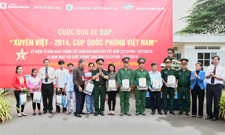 QĐND - Ngày 3-12, sau thành công tốt đẹp của chặng 1, Cuộc đua xe đạp "Xuyên Việt-2014, Cúp Quốc phòng Việt Nam" tiếp tục diễn ra chặng 2 từ TP Cần Thơ đến TP Hồ Chí Minh. Trước khi đoàn đua xuất phát, Ban tổ chức Cuộc đua đã tổ chức lễ trao quà tình nghĩa và trao thưởng chặng 1. Tham dự buổi lễ có Trung tướng Đinh Văn Cai, Chính ủy Quân khu 9; đồng chí Lê Văn Tâm, Phó chủ tịch thường trực UBND TP Cần Thơ; Thiếu tướng Phạm Văn Huấn, Bí thư Đảng ủy, Tổng biên tập Báo Quân đội nhân dân, Trưởng ban tổ chức cuộc đua... cùng đại diện nhiều ban, ngành, cơ quan, đơn vị và đông đảo nhân dân TP Cần Thơ.