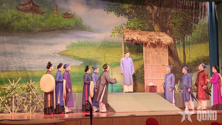 Cảnh trong vở chèo "Nguyễn Văn Cừ-Tuổi trẻ chí lớn" do NSND Tự Long đạo diễn.