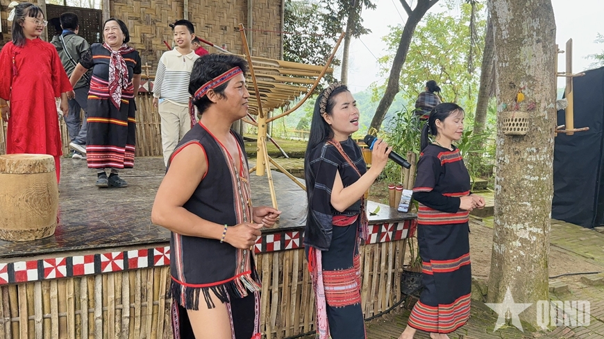 Trong trang phục truyền thống rực rỡ, đồng bào Xơ Đăng, Cơ Tu, Ba Na... tái hiện khung cảnh mùa xuân Tây Nguyên. Tiếng chiêng, tiếng trống hòa cùng lời ca về đại ngàn, tạo nên bức tranh văn hóa sống động giữa không gian xuân ở Làng Văn hóa - Du lịch các dân tộc Việt Nam.