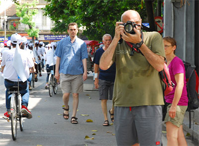 | Khách du lịch nước ngoài dạo phố Hà Nội. Ảnh: Minh Phi. |