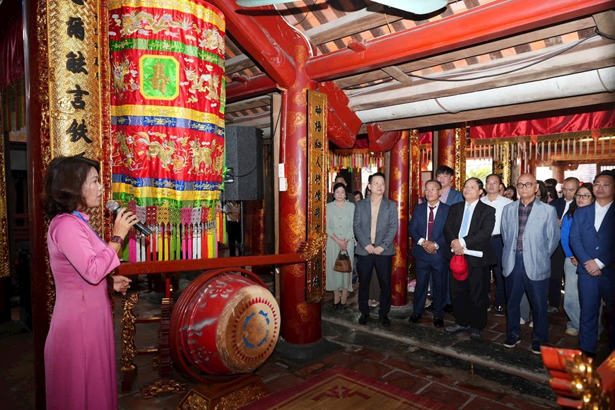 | Các đại biểu tham quan, nghe giới thiệu về đền Phù Đổng. Ảnh: HNMO |