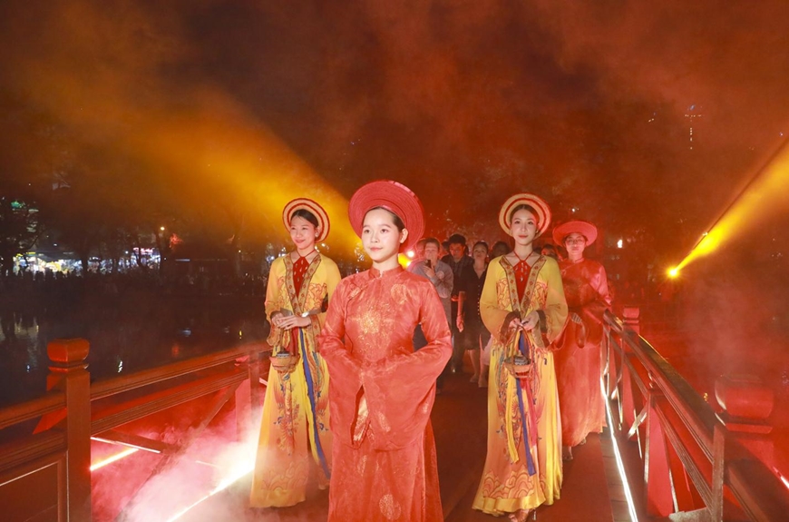| Tour đêm "Ngọc Sơn - Đêm huyền bí" kể câu chuyện lịch sử thông qua nghệ thuật đương đại. Ảnh: KHÁNH HÒA |