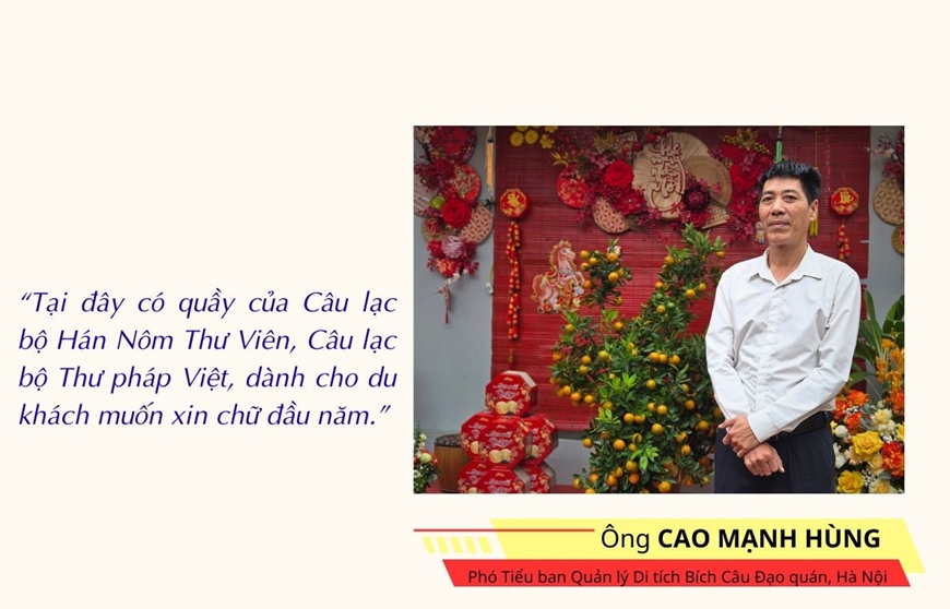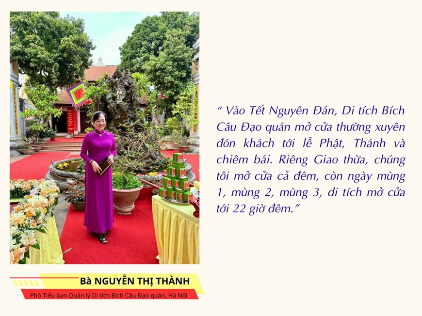 Bà Nguyễn Thị Thành - Thủ nhang Đền Bích Câu, Phó Tiểu Ban Quản lý Di tích Bích Câu Đạo quán: “Năm nay, Di tích được trang hoàng rực rỡ hơn những năm trước với mong muốn bách gia trăm họ tới lễ đầu năm đều thêm hoan hỷ. Ban Quản lý chúng tôi rất tâm huyết từ việc sắm sửa lễ vật dâng Phật, Thánh, đến việc trang hoàng không gian và phân công công tác tiếp đón khách hành hương”.