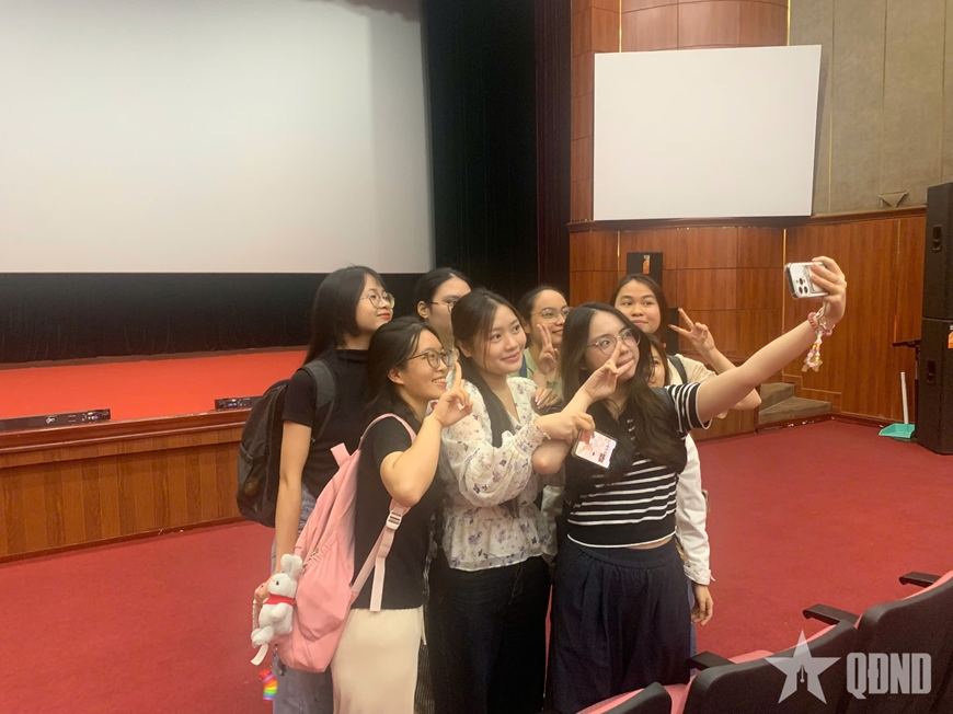 Các bạn trẻ hào hứng ghi lại những khoảng khắc tại rạp Ngọc Khánh khi đến xem phim miễn phí. |