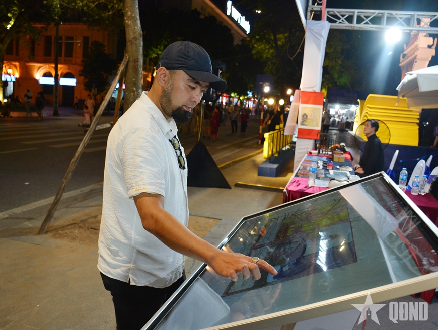Du khách nước ngoài tìm hiểu tại Khu trưng bày, triển lãm với chủ đề “Thăng Long - Hà Nội: Khát vọng vươn mình”. |