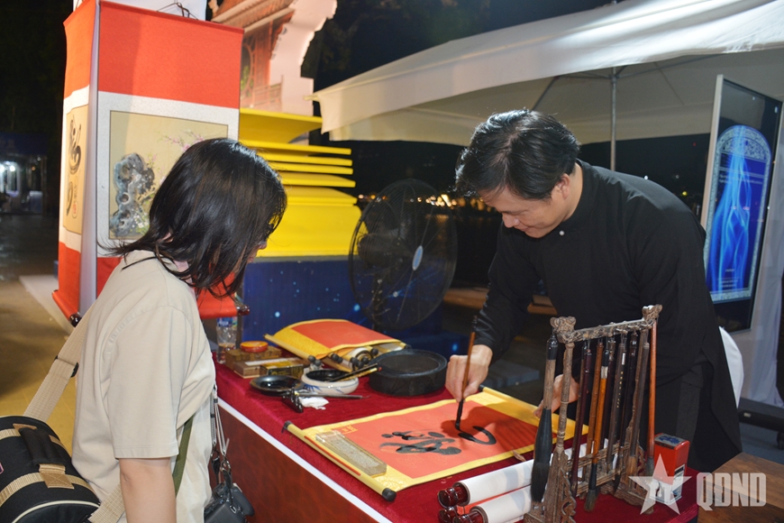 Hoạt động viết chữ thư pháp tại Khu trưng bày, triển lãm với chủ đề “Thăng Long - Hà Nội: Khát vọng vươn mình”. |