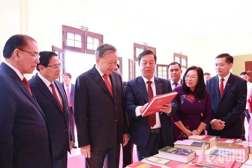 | Tổng Bí thư Tô Lâm, Thủ tướng Phạm Minh Chính cùng các đồng chí lãnh đạo, nguyên lãnh đạo Đảng, Nhà nước tham quan các ấn phẩm của Nhà xuất bản Chính trị quốc gia Sự thật trưng bày tại Đại hội đại biểu Đảng bộ các cơ quan Đảng Trung ương lần thứ nhất, nhiệm kỳ 2025 - 2030. Ảnh: NGUYỄN CHẮT |
