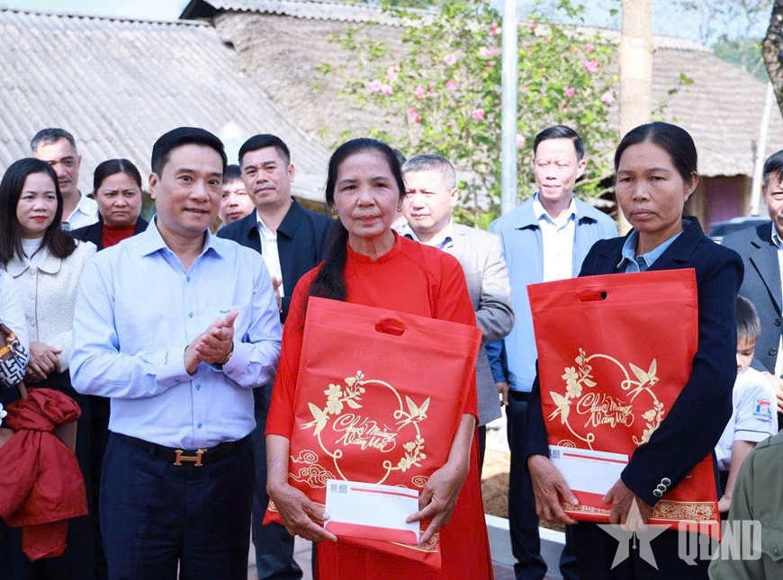 | Lãnh đạo Nhà xuất bản Chính trị quốc gia Sự thật tặng quà tri ân gia đình đã hiến đất để Nhà xuất bản xây dựng, tôn tạo, mở rộng khuôn viên điểm di tích Nhà xuất bản tại thôn Làng Bình, xã Chiêm Hóa, tỉnh Tuyên Quang. Ảnh: NGUYỄN CHẮT |