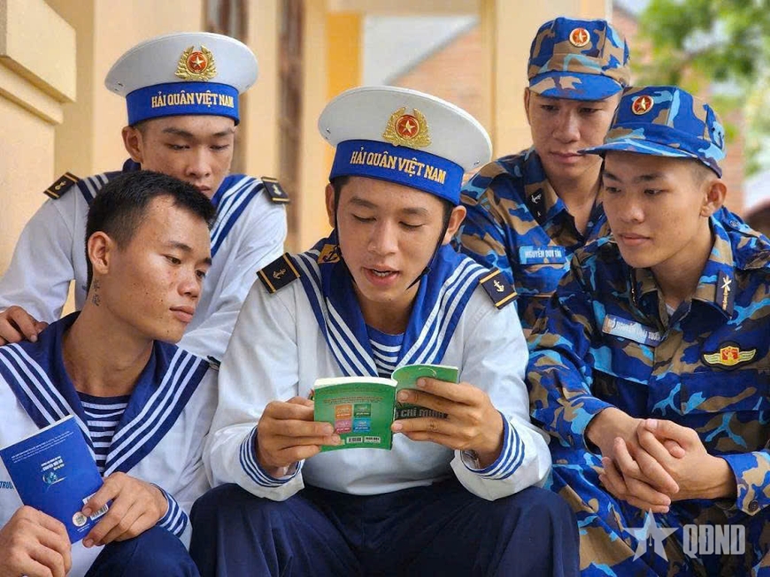 | Chiến sĩ Trường Sa đọc sách do Nhà xuất bản Chính trị quốc gia Sự thật gửi tặng. Ảnh: NGUYỄN CHẮT |