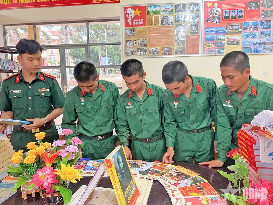| Cán bộ, chiến sĩ Tiểu đoàn 1, Trung đoàn 48 (Sư đoàn 320) tham quan và đọc sách tại phòng Hồ Chí Minh của đơn vị. |