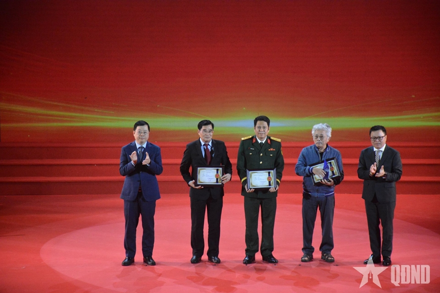 | Tác giả Chu Lai, đại diện Nhà xuất bản Quân đội nhân dân và đối tác liên kết nhận giải Sách được bạn đọc yêu thích cho tiểu thuyết "Mưa đỏ". |