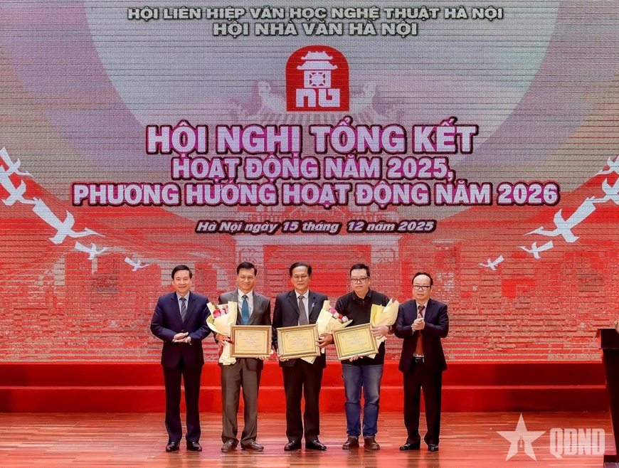 Tại hội nghị tổng kết, Hội Nhà văn Hà Nội đã trao Giải thưởng Văn học năm 2025 cho 3 tác phẩm, cụ thể: Tập thơ “Đi về phía mặt trời” của nhà thơ Lê Cảnh Nhạc, tập truyện ngắn “Thị trấn cá bông” của nhà văn Đinh Phương và tập thơ dịch song ngữ Nga - Việt “Những cơn bão tuyết” của dịch giả Thái Xuân Nguyên.