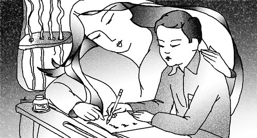 Tôi nao nao hồi tưởng. Giọng nói ấm của cô kề sát vai mình, bên ô cử sổ lớp trông ra đồng làng, những ngọn gió ùa vào làm tung bay mái tóc, cô cúi người, một tay vén ngược lọn tóc mai, một tay chỉ đám hình ô tô, máy bay, con mèo, cây cối… mọc chi chít quanh lề trang vở. Tôi ngượng ngùng bối rối, thuở ấy, những lúc hoàn thành sớm bài luyện chữ, hay con toán đố vui cô giao, tôi có thói quen khó bỏ là… vẽ bậy. Lạ là không như đối với các bạn khác, sự vẽ bậy nơi tôi chỉ gợi lên trên môi cô nụ cười trìu mến. Cô bảo: “Viết chữ đẹp mà vẽ cũng đẹp”. Tôi đỏ mặt tía tai, chẳng biết mình vừa được khen hay bị nhắc khéo…