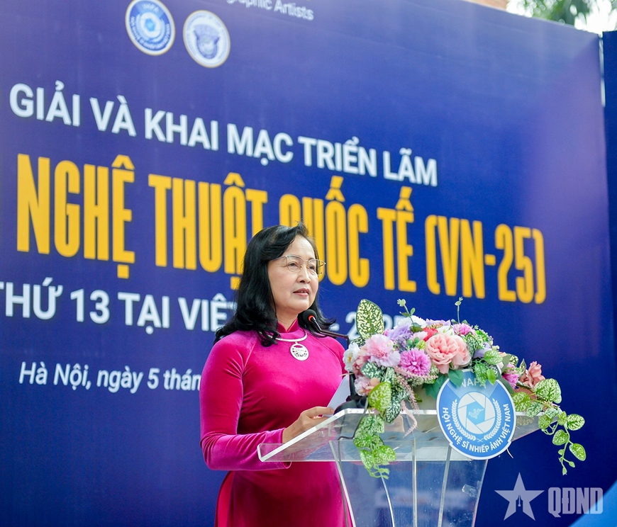 | Nghệ sĩ nhiếp ảnh Trần Thị Thu Đông, Phó chủ tịch Liên hiệp các Hội Văn học nghệ thuật Việt Nam, Chủ tịch Hội Nghệ sĩ nhiếp ảnh Việt Nam phát biểu. |