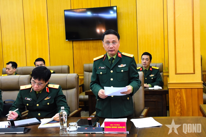 Đại tá Hồ Trọng Tuấn, Hiệu trưởng Trường Đại học Văn hóa Nghệ thuật Quân đội báo cáo kết quả thực hiện kế hoạch tập luyện và công diễn chương trình nghệ thuật.