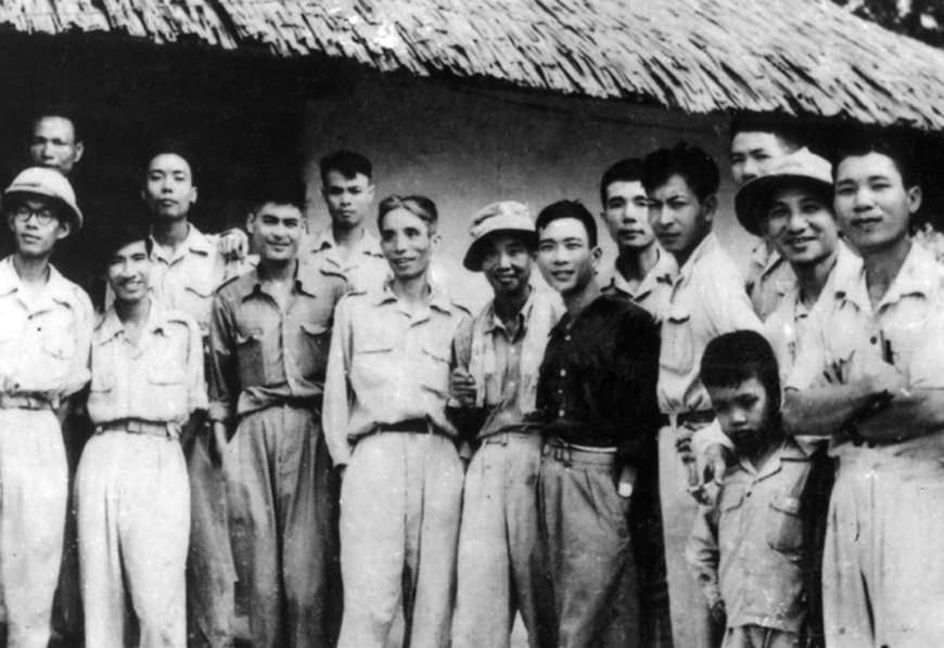 Nhà thơ Tố Hữu (hàng đầu, thứ sáu, từ trái sang) cùng các văn nghệ sĩ tại Việt Bắc. Ảnh: VÕ AN NINH |