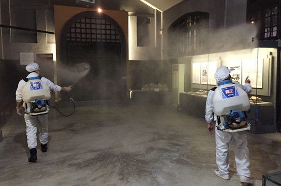 Phun thuốc khử khuẩn tại di tích Nhà tù Hỏa Lò (Hà Nội). |