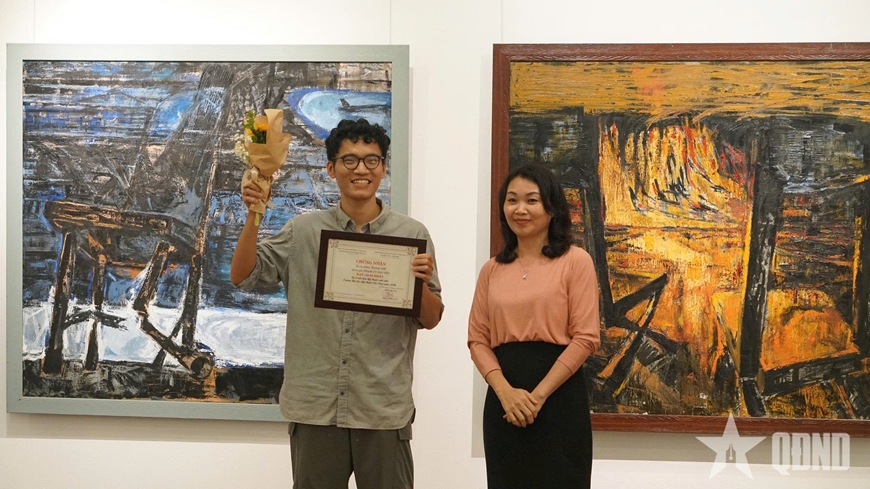 | Đại diện nhà trường trao tặng giải Nhất tới tác giả Phạm Vũ Nguyên với tác phẩm “Thường nhật”. |