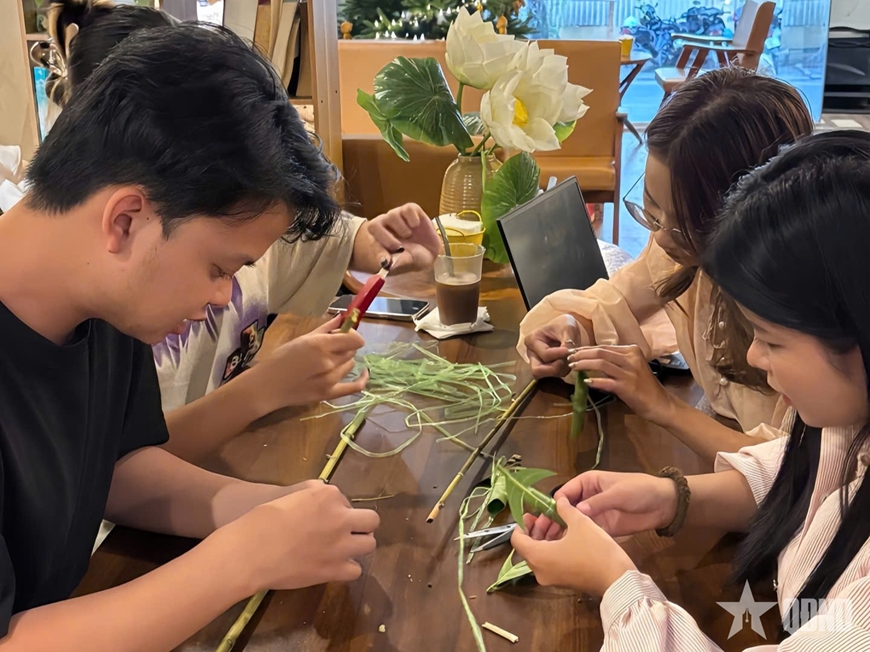 | Nhóm sinh viên thực hiện chương trình "Vũ rối vạn ảnh” tự tay làm những phần quà tri ân khách tham dự. |