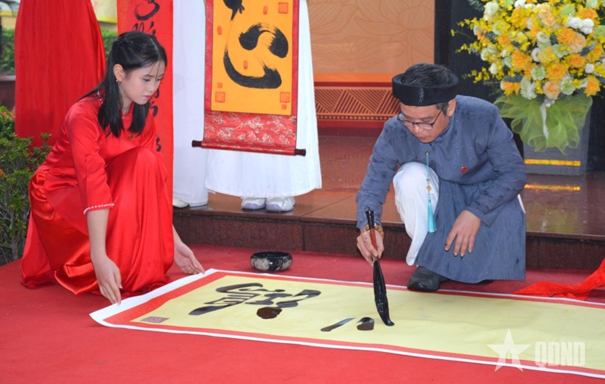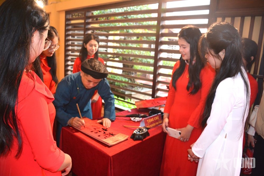 | Đông đảo học sinh, sinh viên tham quan viết chữ thư pháp. |
