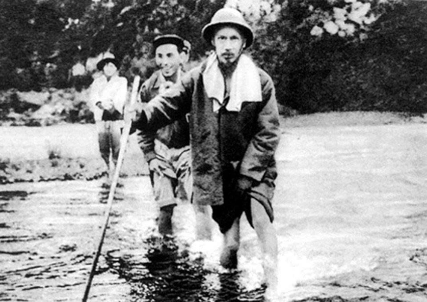 | Bác Hồ lội suối đi công tác ở Chiến khu Việt Bắc. Ảnh: Tư liệu |