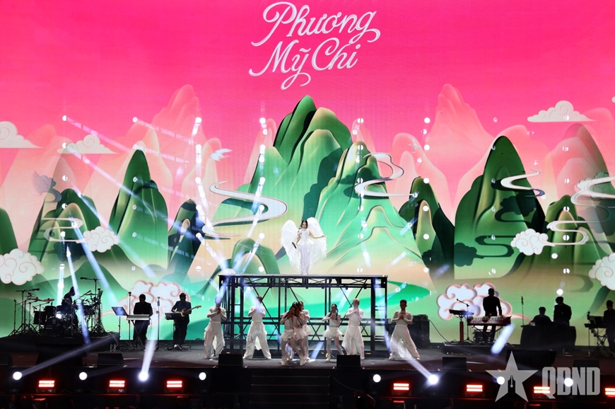 Nữ ca sĩ Phương Mỹ Chi mở màn đêm nghệ thuật với ca khúc “Vũ trụ cò bay”.