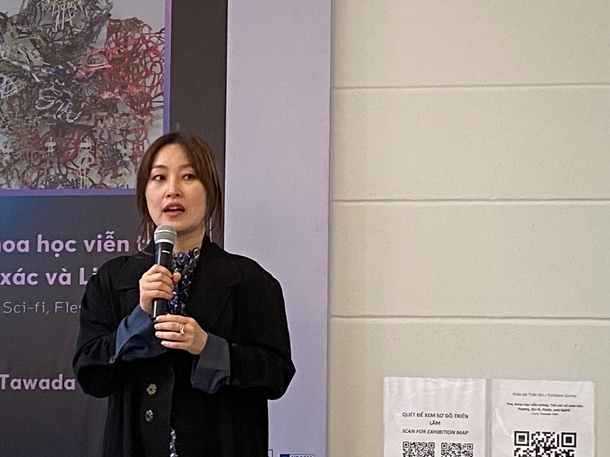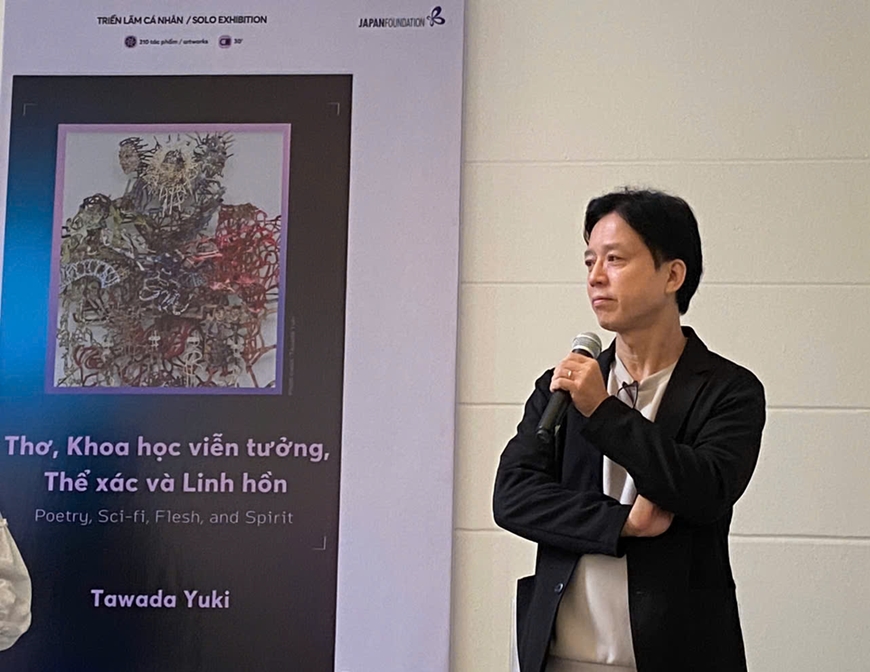 | Nghệ sĩ Tawada Yuki - Giáo sư Trường Đại học Nghệ thuật Kyoto phát biểu tại triển lãm. |