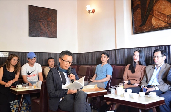 Nhà văn Nguyễn Vĩnh Nguyên (ngồi phía trước) giới thiệu tác phẩm tại buổi gặp mặt.