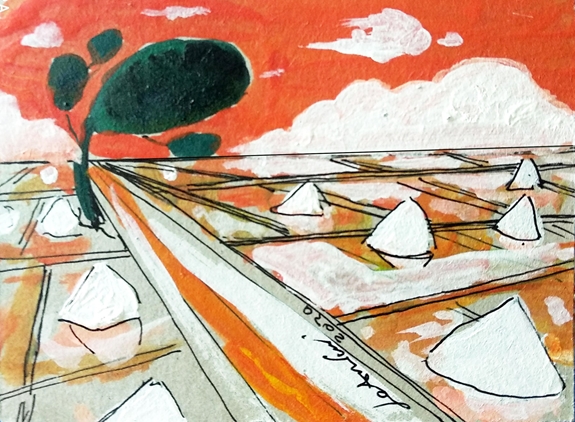 Mẹ đi ra ruộng muối/bòn nắng, té cát, dồn nước biển/nhịp chân mẹ theo trò cút bắt với mây đen vần vũ/mái tóc của mẹ/áng mây giăng/những giọt mồ hôi rơi ướp mặn thêm cho hạt/mùa hạt trắng phau mang tên con...