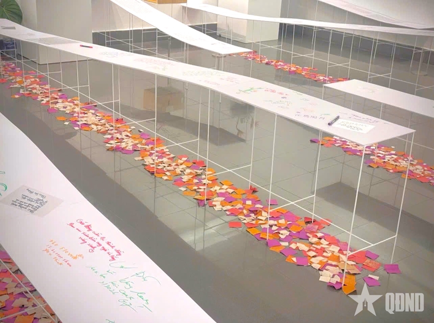 | Trong không gian nghệ thuật, các tác giả và những vị khách cùng nhau để lại lời chúc tốt đẹp trên các mô hình tượng trưng cho làn gió. |